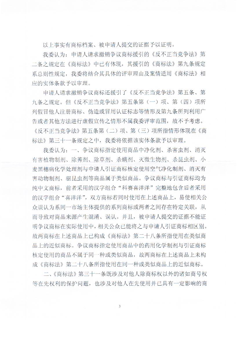 裁定 商标评审委员会收到我司的撤销材料后,经过认真审查,裁定,撤销“科赛喜洋洋”商标在“净化剂,杀害虫剂,消灭有害植物制剂,除莠剂,除草剂,杀螨剂,灭微生物剂,杀昆虫剂,小麦黑穗病化学处理剂”注册,只核准该商标在“药用化学制剂”注册。 点评 佳茂公司对《商标法》及商标审查规则充分理解下,认为“科赛喜洋洋”商标已经完整包含合肥沃化工有限公司在具有一定影响的,且显著性较强的“喜洋洋”商标,如果两个商标共存,一定易使相关公众认为“科赛喜洋洋”是“喜洋洋”的系列商标,从而对产品的来源产生误认,所以“科赛喜洋洋”商标应该予以撤销撤销。 这提醒商标申请人,千万别想搭便车,品牌的创立需要踏踏实实经营。