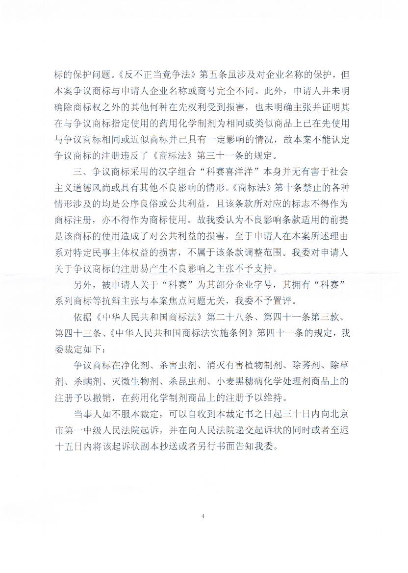背景 经过我司监测,发现济南科赛基农化工有限公司在2005-08-12向商标局申请注册"科赛喜洋洋"商标,并于2009-01-21被商标局核准注册,注册号为4832033。 合肥沃德化工有限公司收到我司的监测报告后,立即委托我司对该商标申请撤销。
